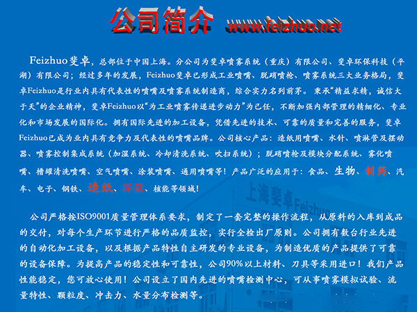 斐卓公司是一家規(guī)?;墓I(yè)噴嘴、脫硝噴槍、噴霧集成系統(tǒng)生產(chǎn)廠家;是國內(nèi)高影響力噴嘴品牌!主營:工業(yè)噴嘴,脫硝噴槍及流量分配|泵站集成控制系統(tǒng),造紙用噴嘴、噴淋管、擺動器等出水裝置!