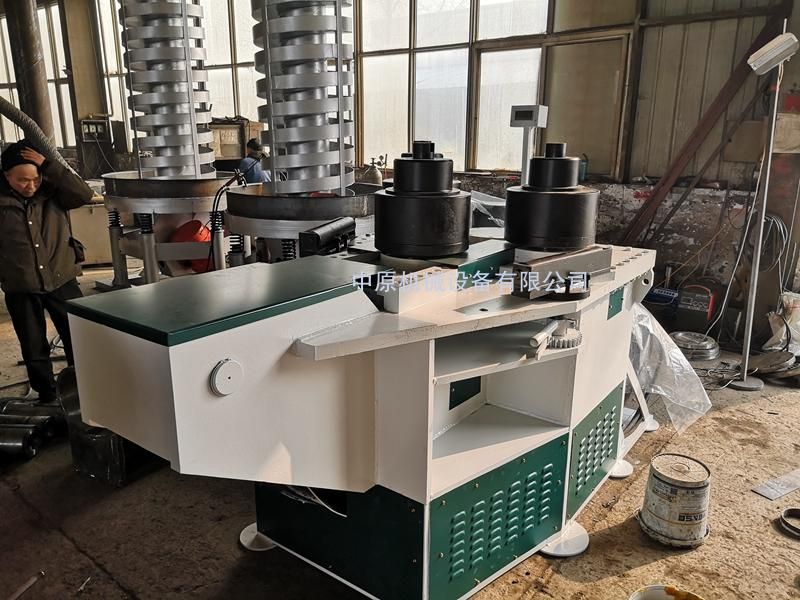 床身采用鋼板焊接件,焊后經(jīng)過退回火等熱處理工藝,消除焊接應(yīng)力,保證加工精度。床身為一封閉式框架結(jié)構(gòu),驅(qū)動兩輥位置固定,可以進行正反方向旋轉(zhuǎn),油缸推進??汕昂笠苿?,兩固定模的轉(zhuǎn)動為液壓傳動、由液壓馬達驅(qū)動。推進模由液壓油缸的伸縮來完成。傳動平穩(wěn)、安全可靠;在固定模的兩側(cè)設(shè)有托輥裝置,托輥既可以做升降運動,也可以做旋轉(zhuǎn)運動。配合模具與導向輪同時作用有利于控制型材的卷制精度。